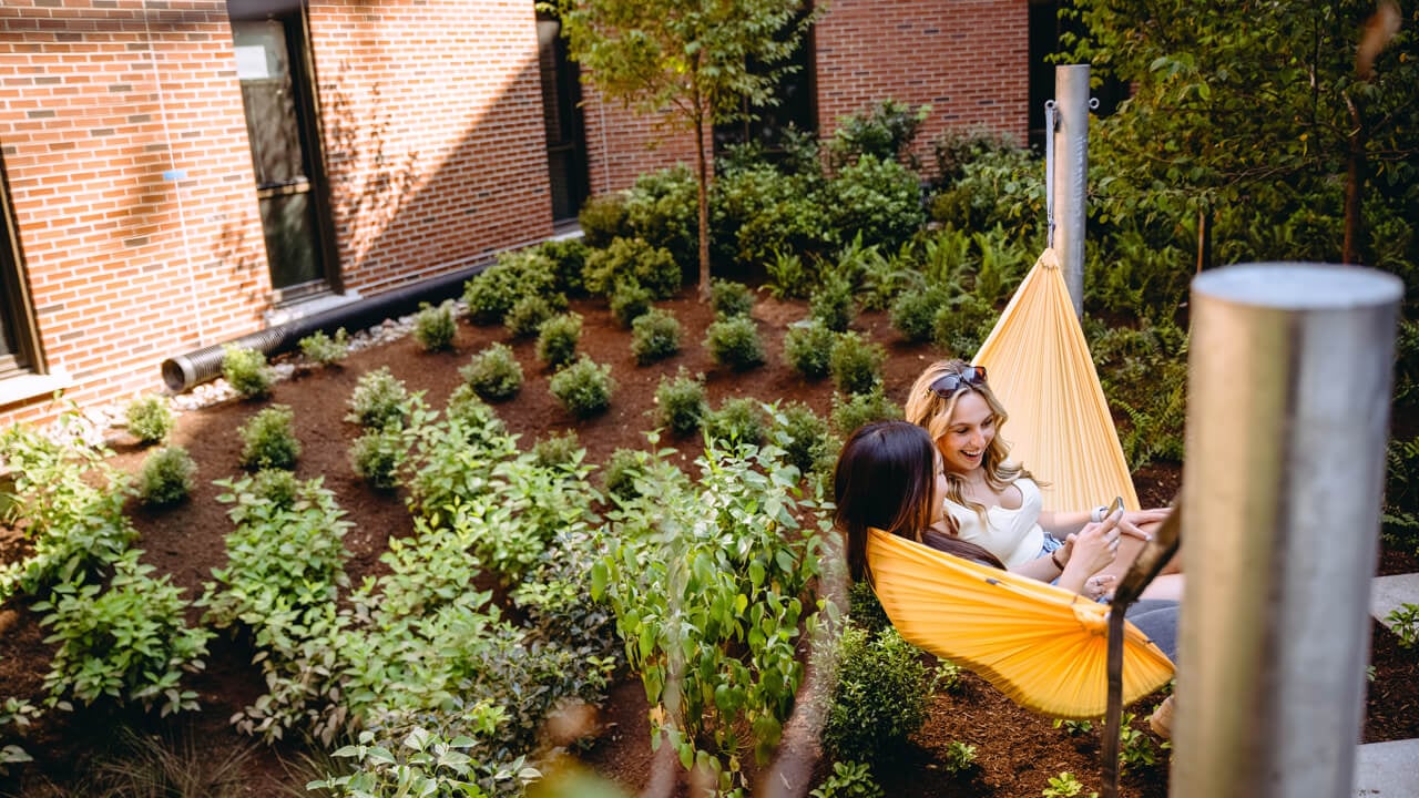 The outdoor courtyard in The Grove residence hall.