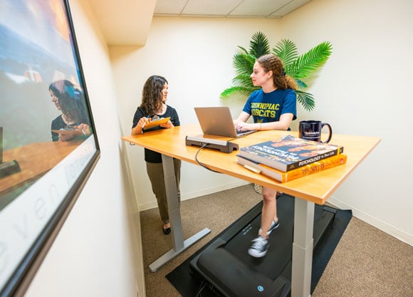 A female student working at a standing desk while on a walking pad being studied by a woman with a clipboard