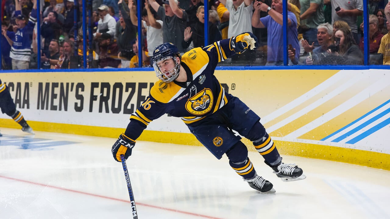 Pecknold had been deferential to the other participants whenever the press asked him to consider history’s role in this Frozen Four. It was inescapable: Boston University, Michigan and Minnesota had combined to win 19 national titles. All three schools fielded varsity hockey teams prior to Quinnipiac’s founding in 1929. In a nod to another latecomer to national prominence of unlikely origin, athletic director Greg Amodio often refers to the Bobcats as “the Gonzaga of college hockey.”