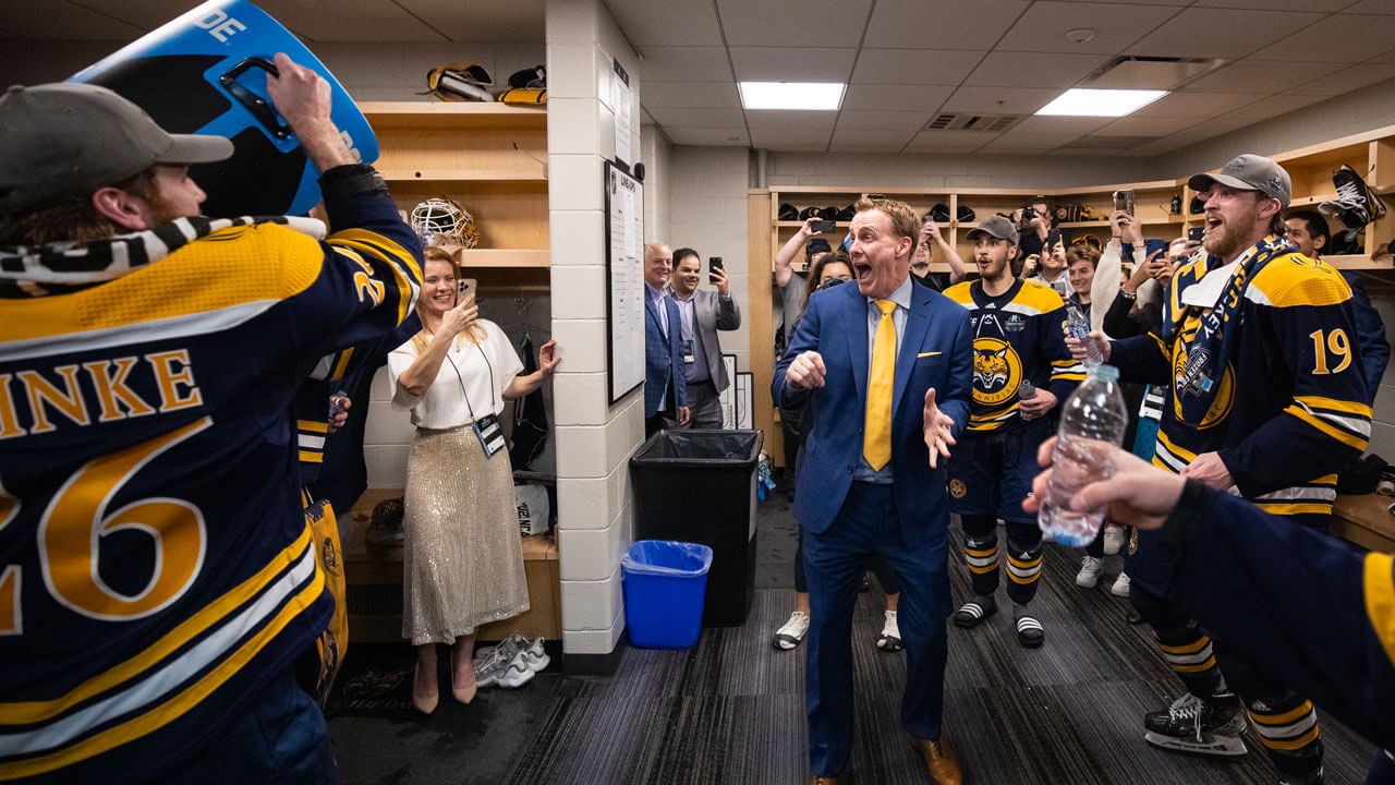 The Bobcats had just secured the first NCAA Division I national championship in school history with a dizzying sequence destined to loop forever in college hockey lore, and their coach was doing his best to bottle his emotions. But now he was being asked to unbottle them before a crowd of 19,444 and close to a million more watching at home.