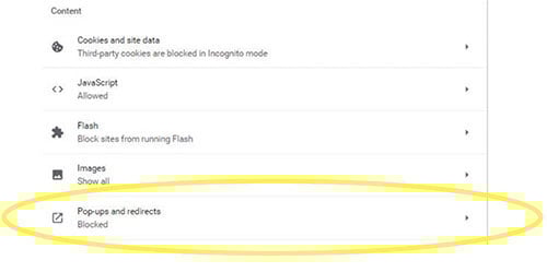 On the Pop-ups and redirects menu, next to Allowed to send pop-ups and use redirects click Add