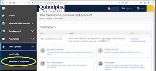 All students can grant their parent, guardian, spouse or authorized person access to a proxy version of Self-Service, which enables the proxy user to access academic and/or financial information for the student. As such, the proxy will have access to view grades, account activity and student statements as well as make online payments and set up payment plans on behalf of the student. Additionally, by granting proxy access, Quinnipiac University will email both students and authorized proxy users regarding important billing information.