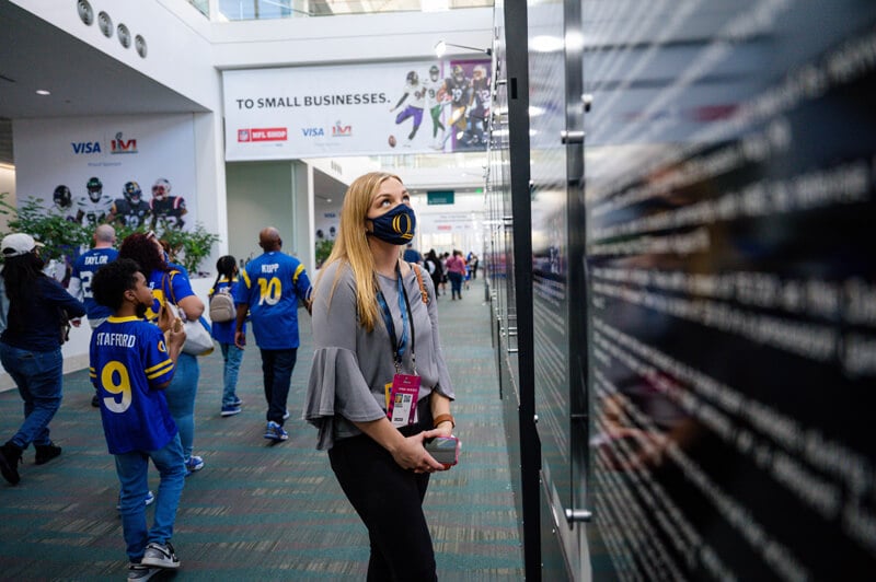 Second-year public relations major Sydney Handler ’23 stands underneath one of the Super Bowl Experience immersive displays — a tunnel lined with TV screens where fans can enjoy watching behind-the-scenes clips of various NFL teams.