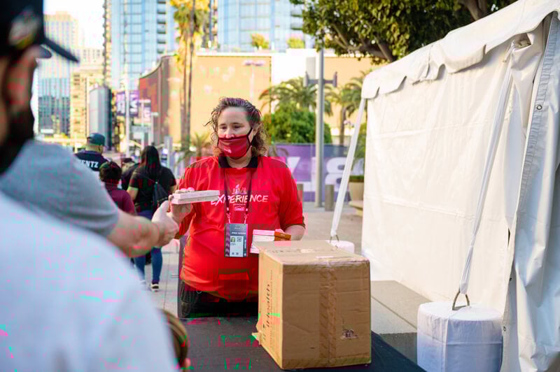 Outside of the Los Angeles Convention Center, staff were handing out at-home COVID-19 rapid antigen tests for individuals and families. Amid a global pandemic, the NFL is keeping health and safety its top priority. Each test kit contains two at-home tests.