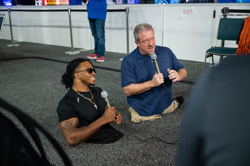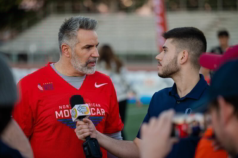 Kurt Warner, two-time NFL MVP and quarterback, is interviewed by Ability Media sports reporter Santino Maione ’23 at the Snoop Dogg Stars ‘N Stripes Flag Football Charity Event in Inglewood, California.
