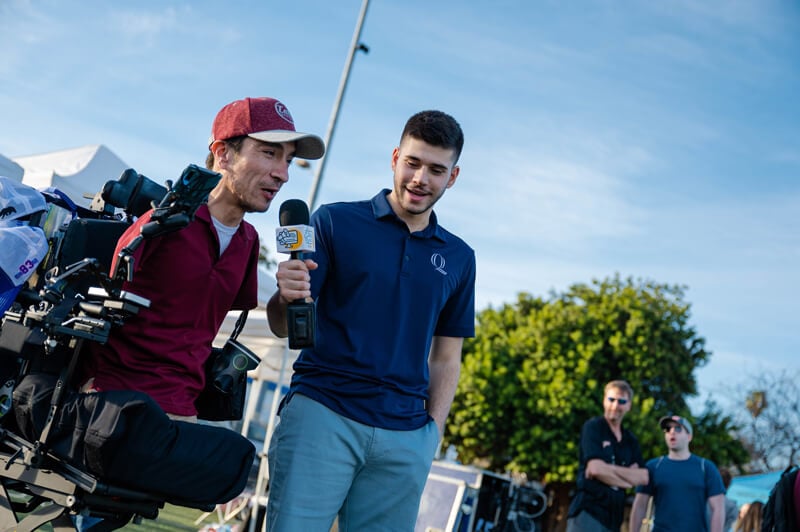 Q30 Television Associate Producer Lo Yarnall ’21, MS ‘22 interviews social media star and athlete Zion Clark. Clark, born with caudal regression syndrome, set a Guinness World Record for being the fastest man on two hands.