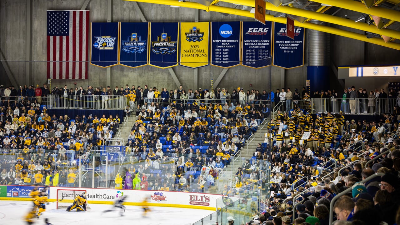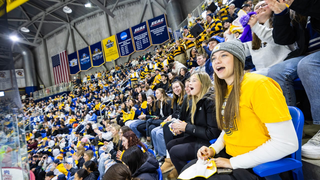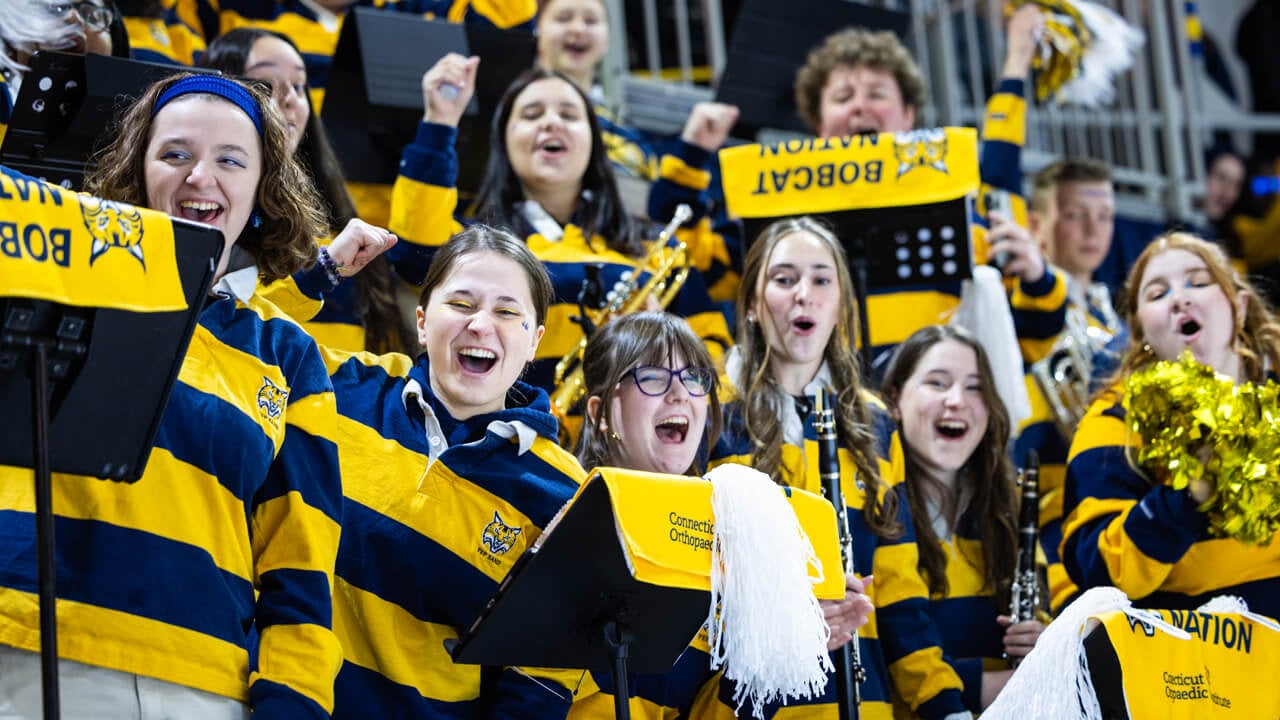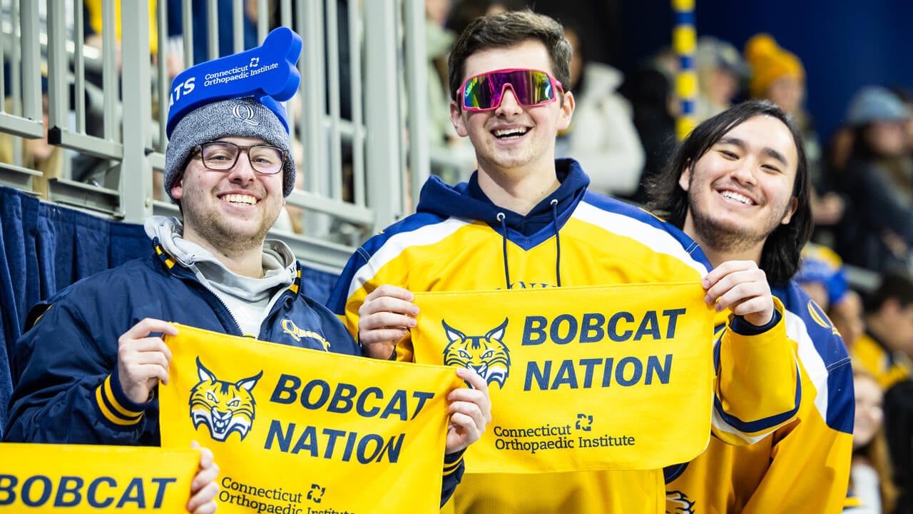 The rush was on when the arena doors opened and hundreds of Bobcats headed for their pick of student section seats. Gavin Gudyka ’27 and Keith Baum ’27 and their friends ran to grab front-row seats by the boards. All student section seats are free for Quinnipiac students at all home games — across each of the university’s 21 Division I teams.