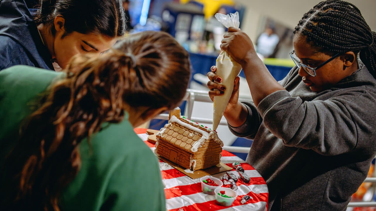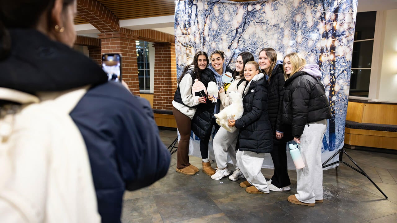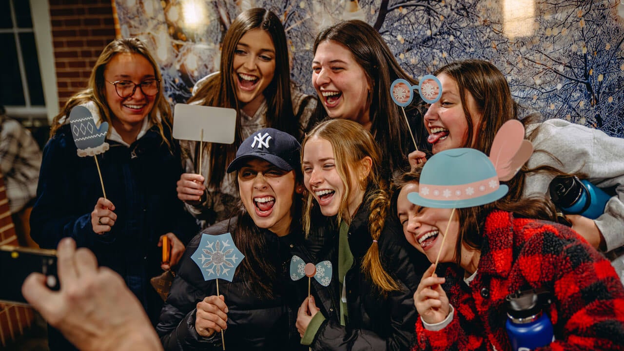 Tracy Balzarano ’27, and Grace Hinton ’27, had fun decorating a gingerbread house and camping it up with some holiday props for a photo in an oversized Happy Holidays selfie frame.