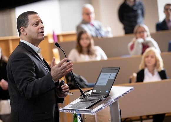 Taylor presented a public lecture titled, “A Diverse World of Opportunity,” on January 31 to a packed audience of students, faculty and staff in the Mount Carmel Auditorium. He is the managing partner in XFC Partners (X-Factor), a firm he founded to create sustainable links between the globe’s largest corporations and untapped sources of talent. He also has served as president and CEO of the Los Angeles Urban League. He was invited to Quinnipiac by President Judy Olian, former dean of UCLA’s Anderson School of Management, from which Taylor graduated with an MBA