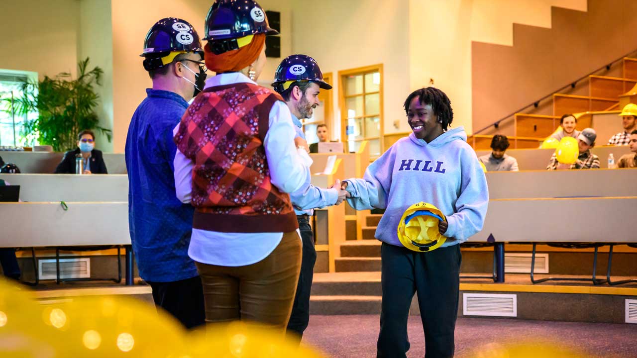 “I feel a mixture of a few things since this is my last hard hat ceremony,” said Juliana Sabin ’23 who received her pending graduation sticker. “I know there’s really exciting things coming after graduation, but it’s also a little bittersweet leaving this part of my life. I’m really grateful for everything School of Computing and Engineering has given me.”