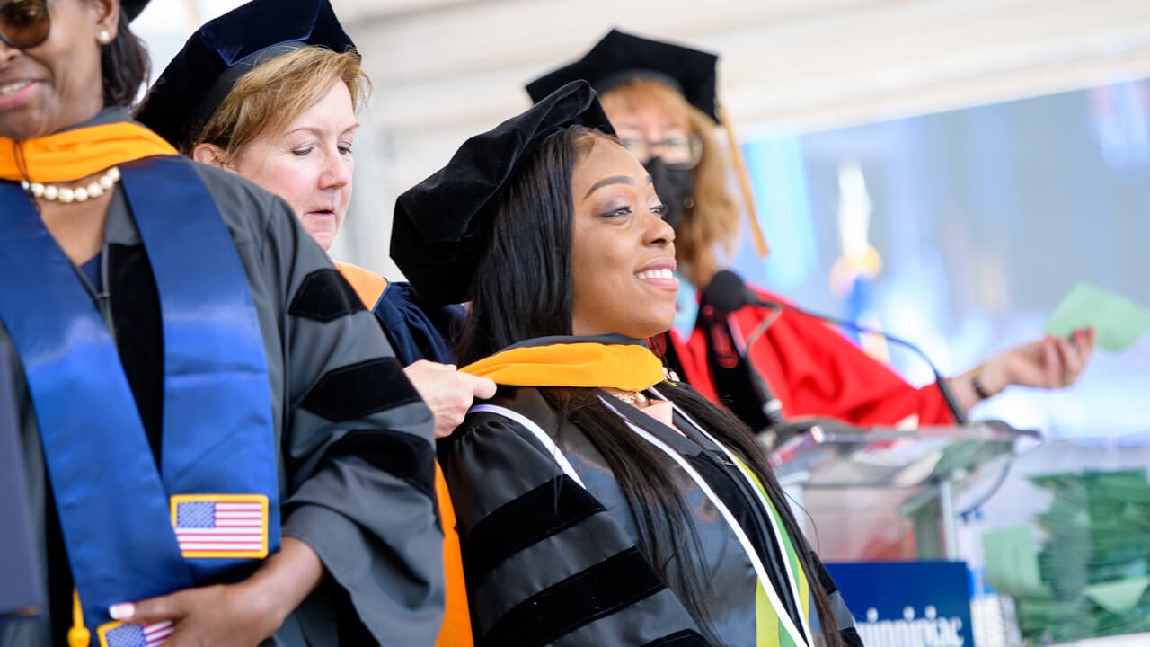 During her address, President Judy Olian noted the tenacity and drive of the graduate students of the Class of 2022, who joined Quinnipiac from 80 different undergraduate institutions, representing 30 states, with ages ranging from 19 to 68.