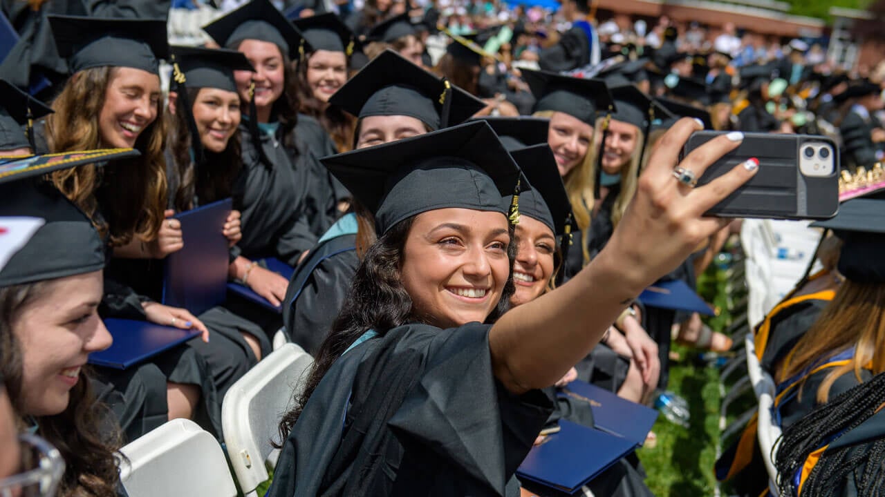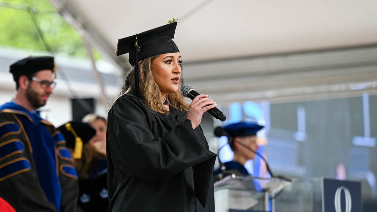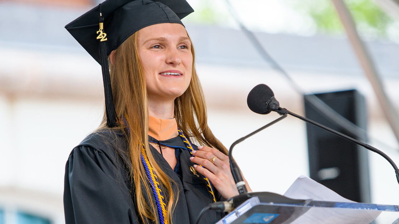 Graduate Student Council President Alyssa Mesaros ’22 delivered the Class of 2022 welcome and provided a reflection on the collective experiences that shaped their graduate education. She encouraged her fellow graduates to bravely face adversity, embrace opportunities, and cherish the life lessons learned along the way before inviting everyone in the audience to take a selfie with her from the podium.