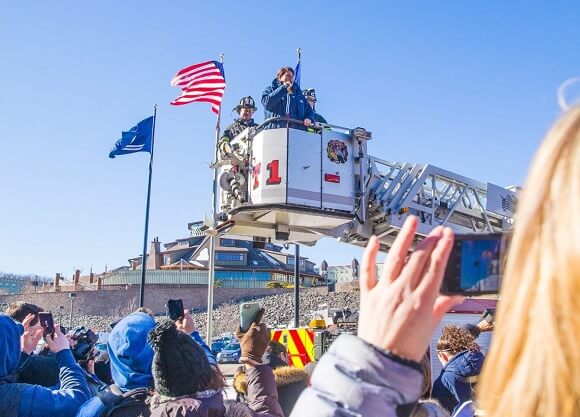 “For the Hamden Fire Department and myself, it shows support of our community. When we heard President Lahey’s remarks, we knew it was a perfect chance to show our support for the girls by volunteering the use of our tower truck,” he said at the rally. “Quinnipiac is as much of a part of our community as anything else is, so for us to come up and show the girls some support, it’s a privilege.”