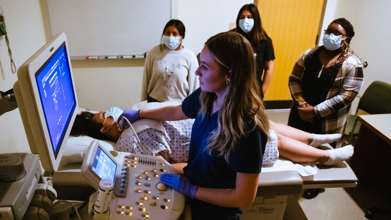 High school students observe as a diagnostic medical sonography student demonstrates the proper use of a sonograph on a patient’s abdomen.