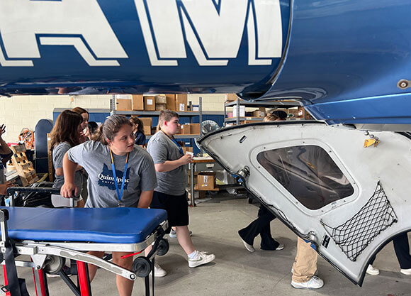 The learning was just beginning. The students, along with Quinnipiac’s Jerilyn Nolan, an academic advisor, and Jason Louis Scozzafava, clinical associate professor of health science studies, got to see Hartford Hospital’s Life Star critical care helicopter and helipad.