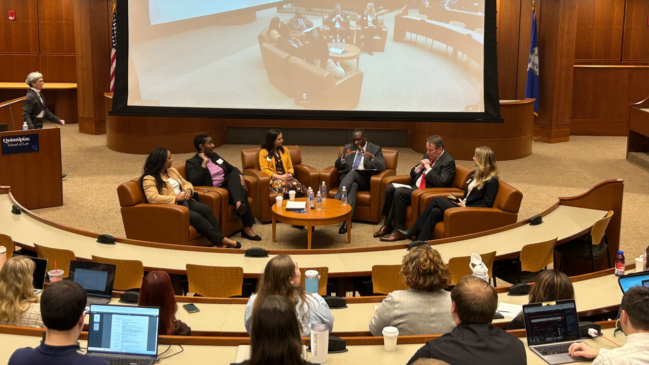After welcoming remarks from School of Law Dean Brian Gallini, the Hon. Victor Bolden, a U.S. District Court judge, led a panel discussion on “What Makes a Great Lawyer,” with Stan Twardy, a partner at Day Pitney LLP; Elyssa Williams, senior legal counsel at Bronx Defenders; Andrea Barton Reeves, commissioner at Connecticut Department of Social Services; Natalie Elicker, Assistant U.S. Attorney in the Connecticut U.S. Attorney’s Office; and Leander Dolphin, managing partner at Shipman and Goodwin LLP.