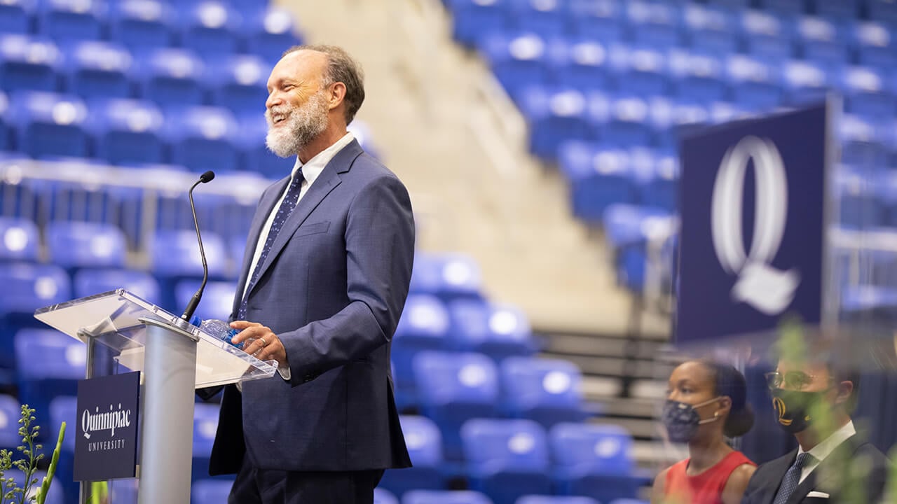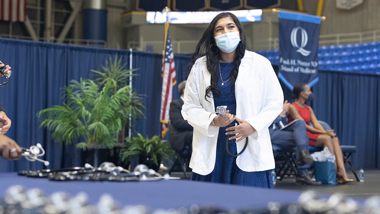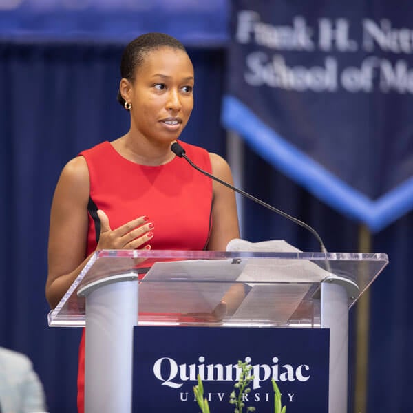 Hinds, the keynote speaker at the August 5 White Coat Ceremony hosted by the Frank H. Netter MD School of Medicine at Quinnipiac, said she wanted to be honest with the 94 aspiring doctors looking to her for encouragement as they begin their own journeys. This year’s class was selected from 9,212 applicants, a 28% increase from last year.