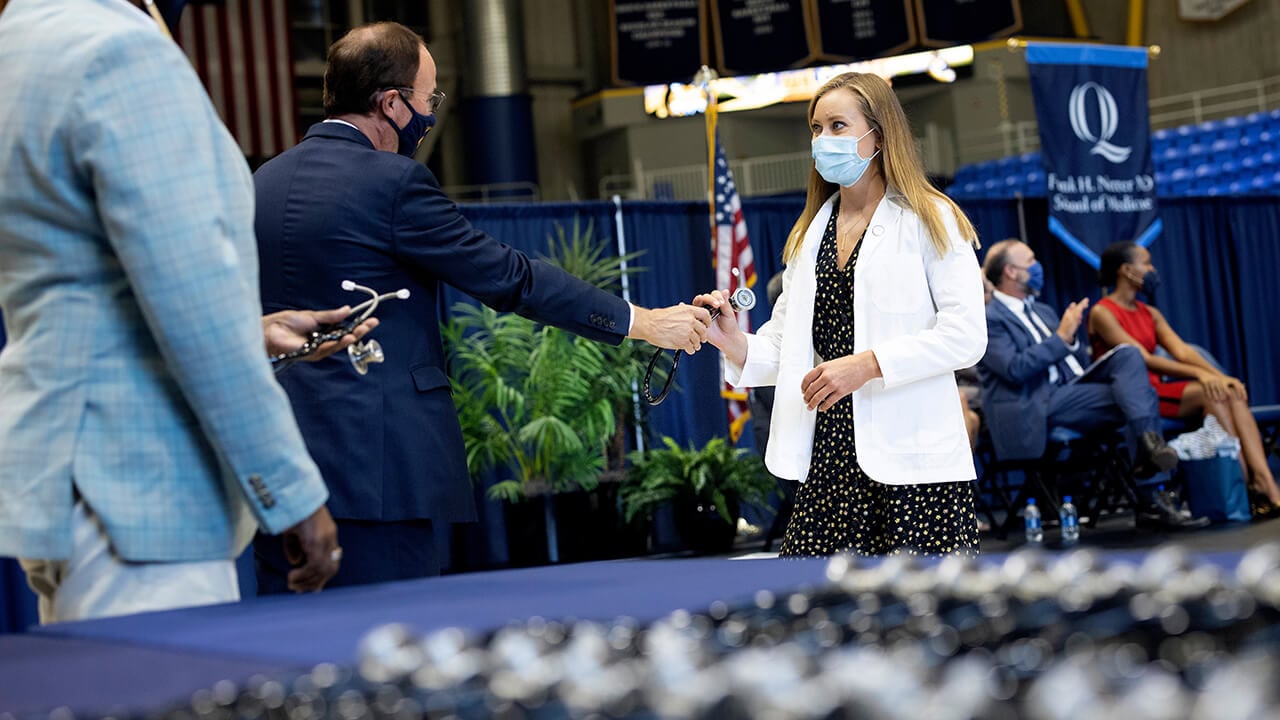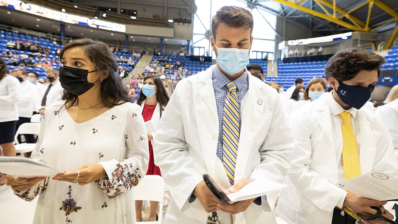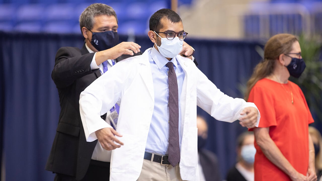 Before they were cloaked by Netter School faculty and led in the recitation of the Hippocratic Oath, they were welcomed by Phillip Boiselle, MD, the school’s new dean and a professor of medicine. He noted that they are undergoing this rite of passage amidst an increasingly fragile dawn in the battle against the COVID-19 pandemic.