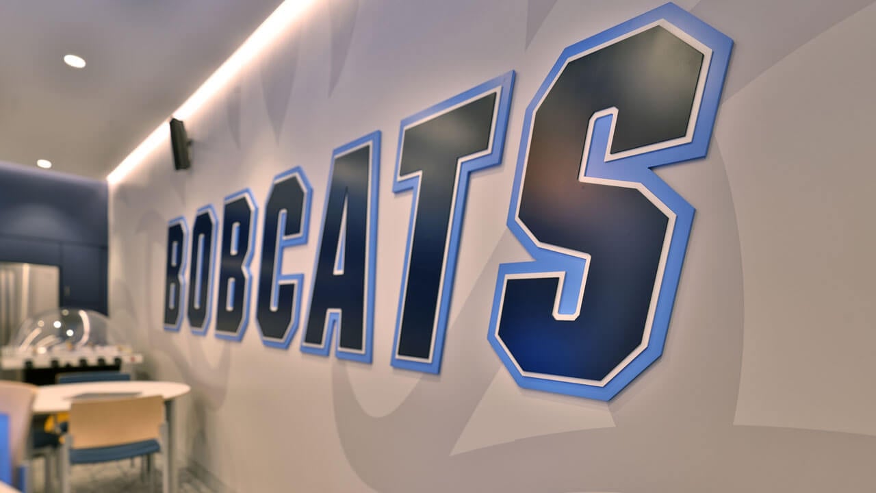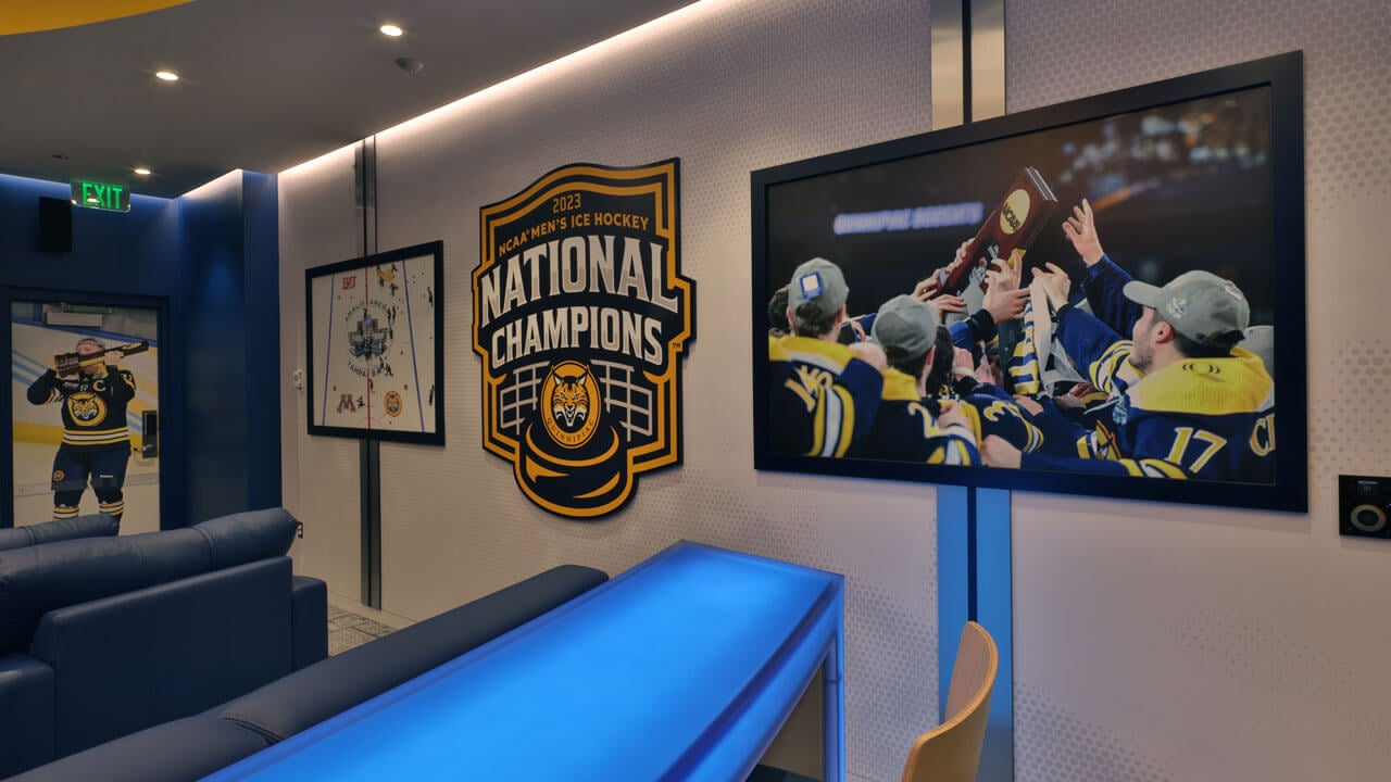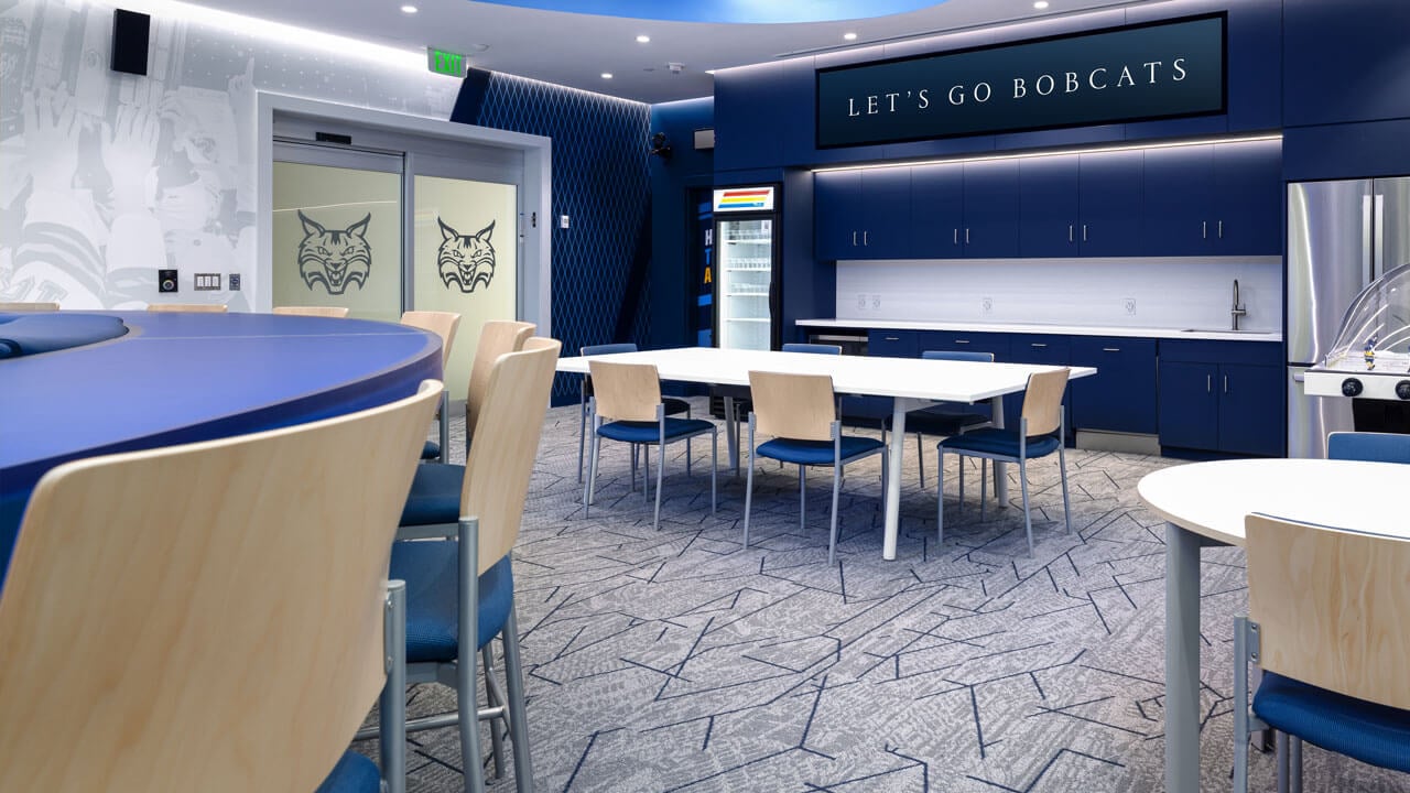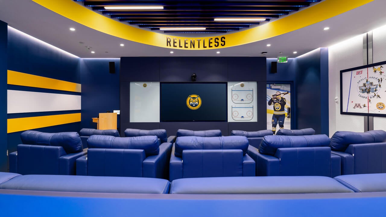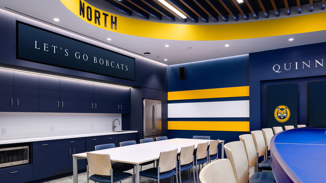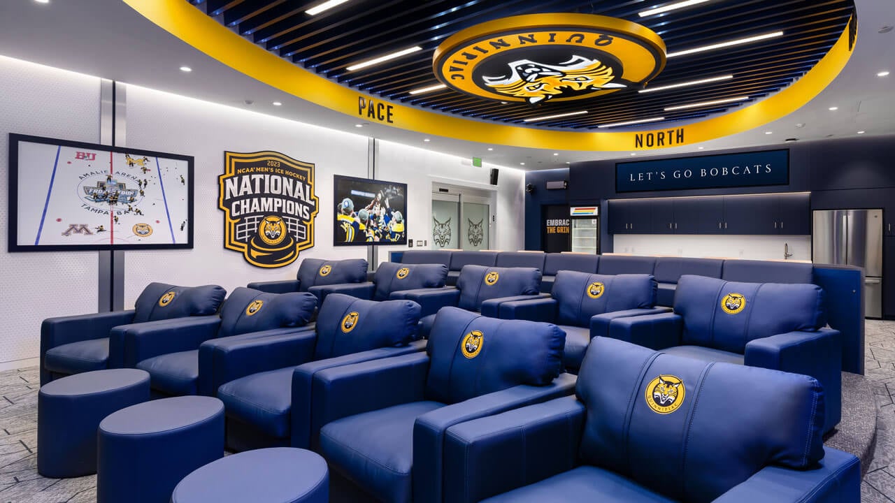Players now have a pristine space for film-study, schoolwork and leisure time, with all the amenities one might expect to find in the players’ lounge of a National Hockey League arena. Peering down from the ceiling in the men’s lounge is the circular Bobcat crest logo, backlit and rendered in three dimensions. The room is ringed in Bobcat gold and emblazoned with words like “relentless,” a nod to the men’s hockey team’s long-running mantra.