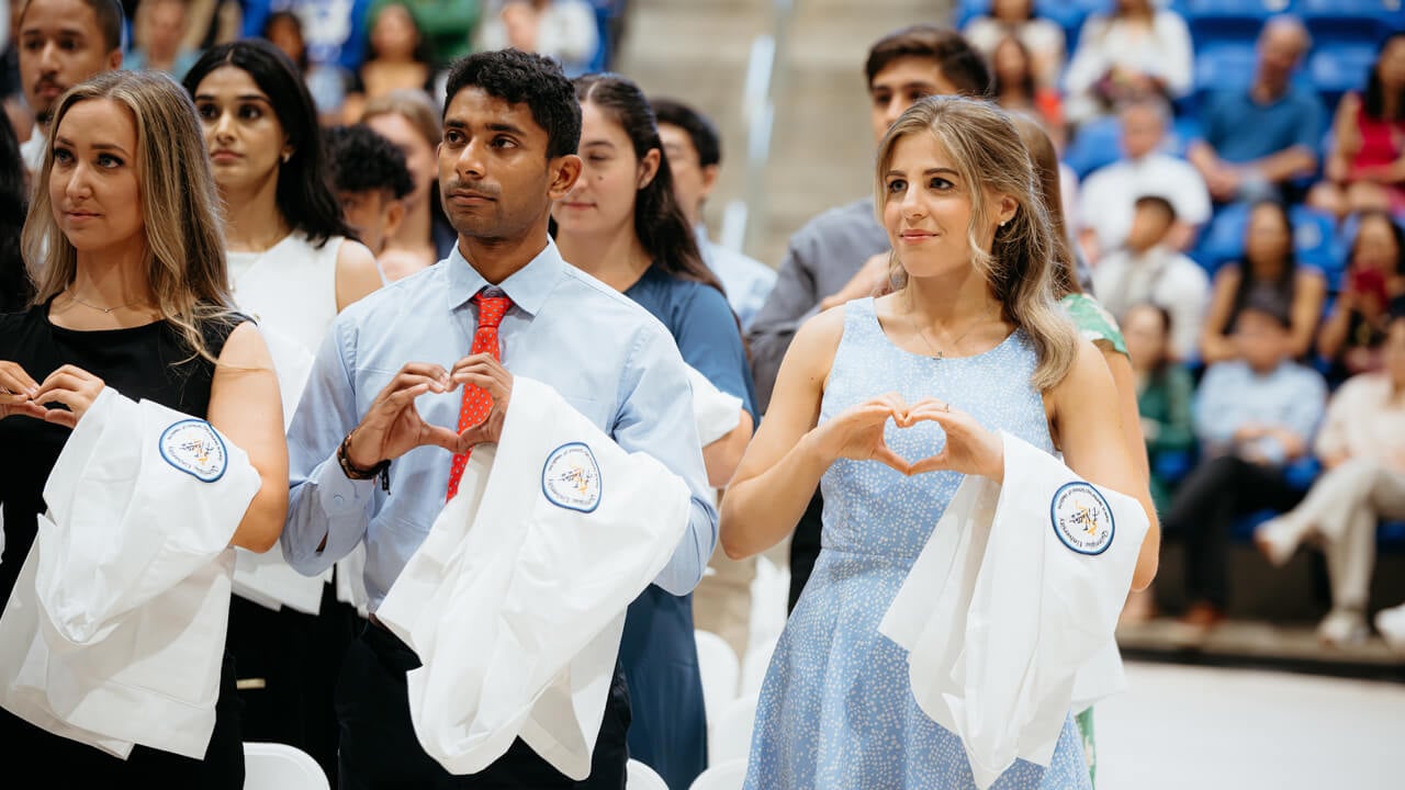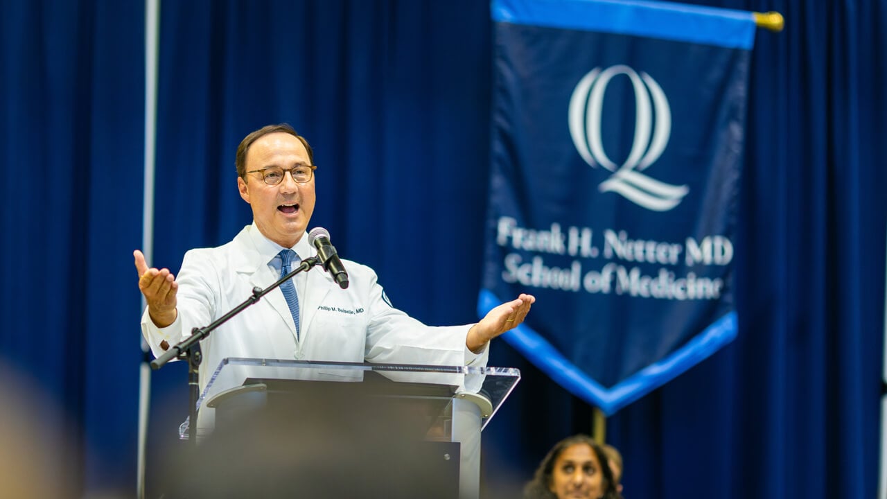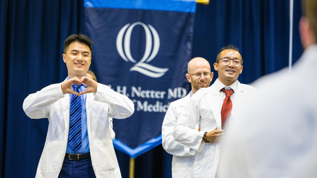 Before they slipped on their white coats, draped their new stethoscopes over their shoulders and stepped up to the podium to introduce themselves to a hearty crowd of family and friends, the first-year students were led in a less formal exercise by Dr. Phillip Boiselle, dean of the Frank H. Netter MD School of Medicine, who closed his remarks by making the hand-heart gesture and sharing “three connected elements of compassion that are visually represented in the heart shape — compassionate care for the patient in front of you, collegial compassion for the healthcare team that surrounds you and compassion for yourself.”