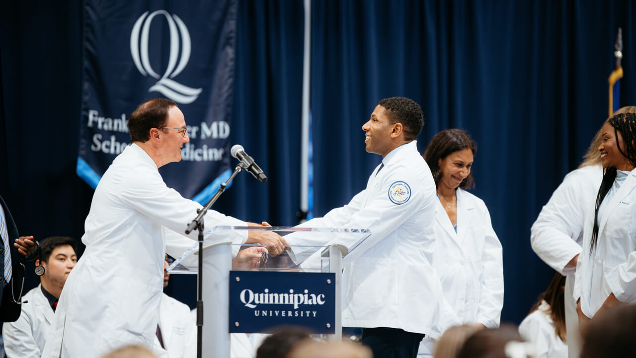 “There are a lot of clubs in our society but this is an extremely difficult one to get into for a variety of reasons, and I think we all know what those are,” said Boatright, who was introduced by his wife, Dr. Renu Boatright, assistant dean for student affairs at Quinnipiac Netter. “To get here, you had to demonstrate tremendous talent, tremendous intellectual ability. But that was only a small component of why you’re here today. I think the key element that we want to celebrate today as you enter into this profession is your humanity.”