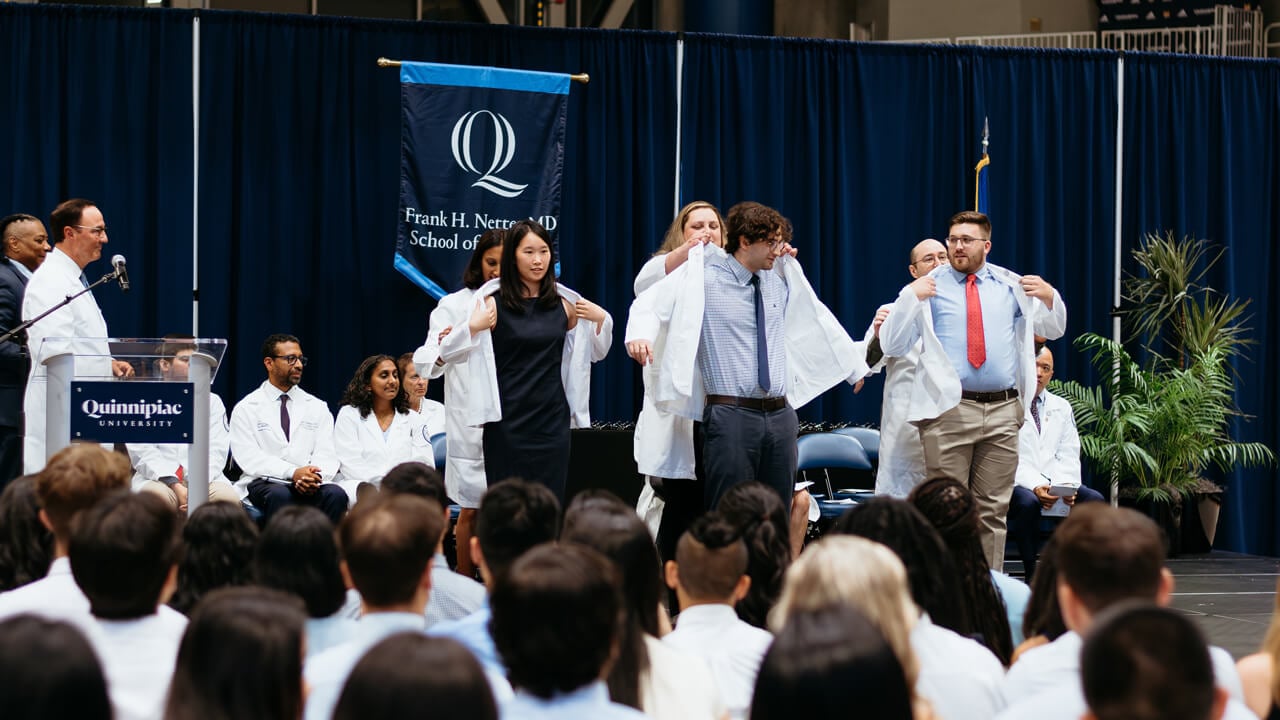 Dr. Lisa Coplit, senior associate dean for faculty affairs, retraced the history of white coats, a symbolic sartorial choice that dates back to the late 19th century, before which physicians, like clergy members, were always clad in black. She encouraged the students to savor this first step in forming their professional identity before faculty members took the stage to assist with the cloaking of the class. Dr. Adam Weinstein, assistant dean for clinical curriculum, then led the students in reciting the Frank H. Netter MD School of Medicine Physician’s Pledge.