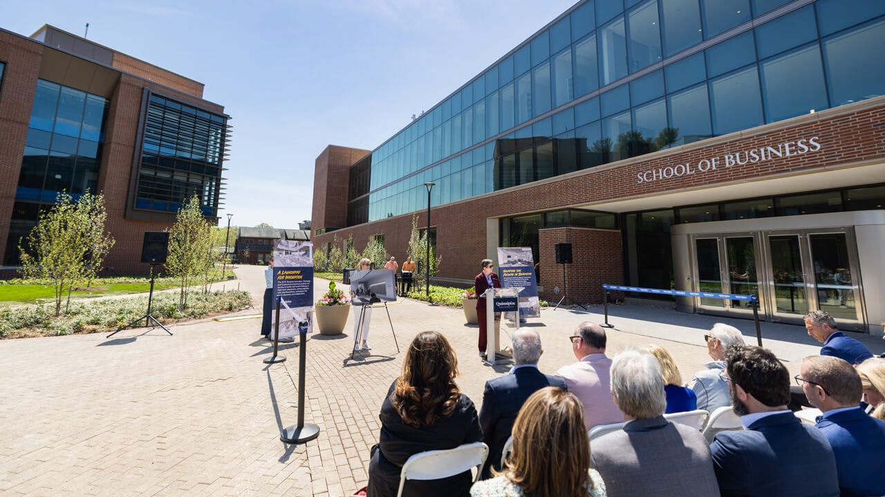 As part of her remarks, Olian announced that the atrium in the School of Business will be named the Brett M. Amendola Family Atrium after Board of Trustee member Brett Amendola ’91 in appreciation for his philanthropic efforts.
