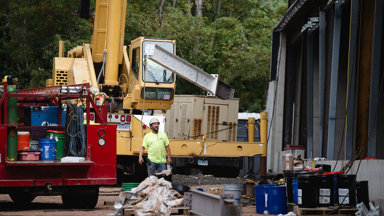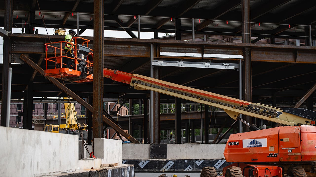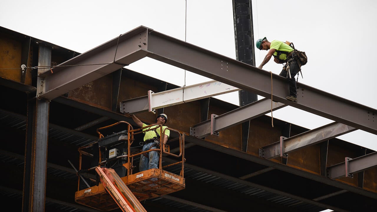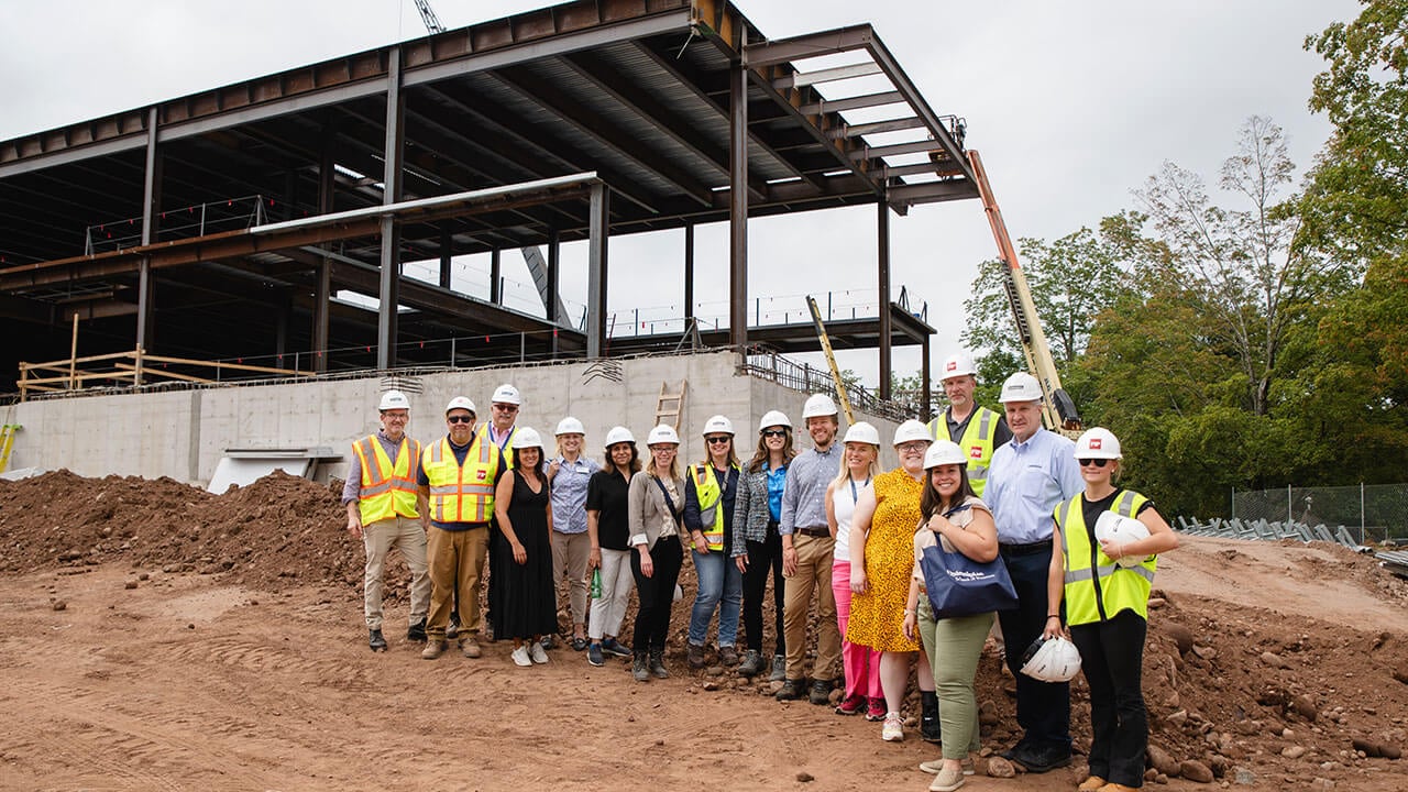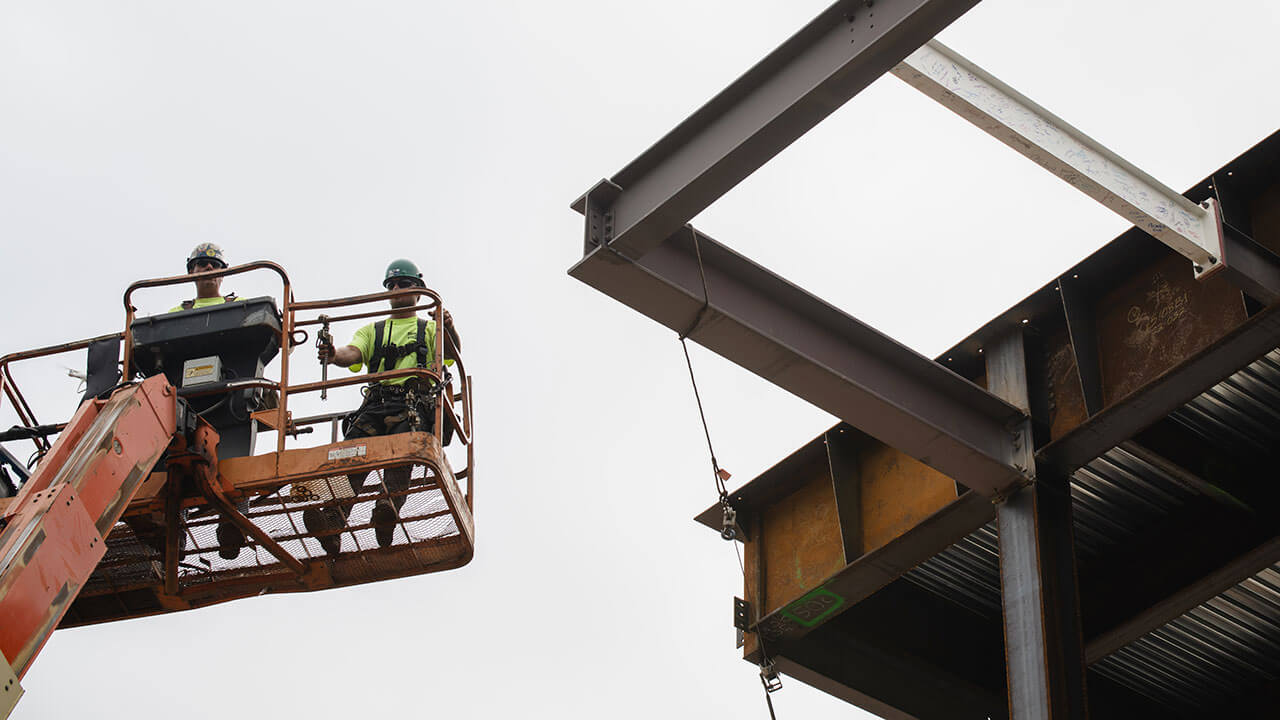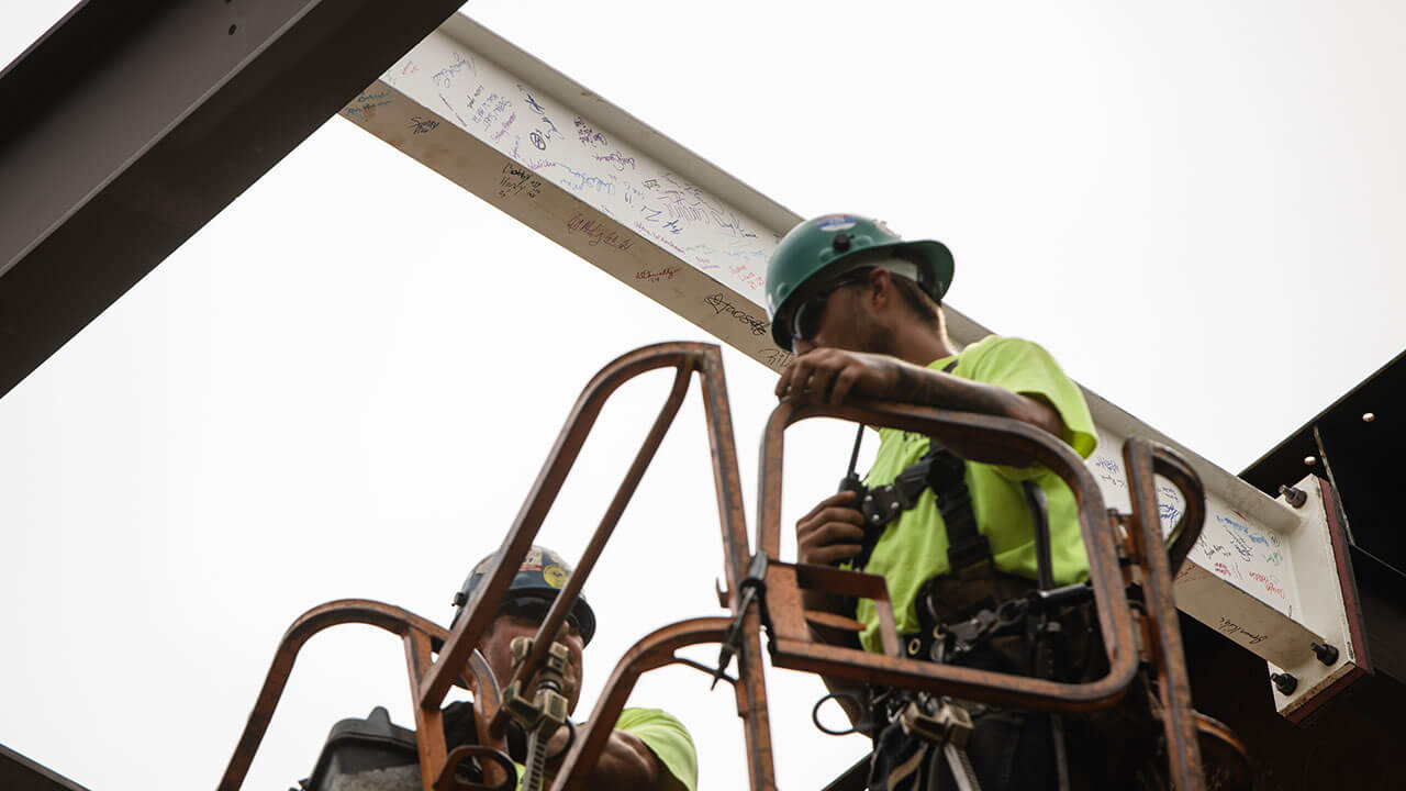 Beam signed by students and faculty membersStaff and faculty talking with hard hats on in front of the construction siteFaculty and staff smiling in front of the construction siteConstruction workers talking to one anotherOrange construction lift in front of brown beamsWorkers on the construction liftConstruction worker in neon green shirt looks up at beamsConstruction workers in green shirts working on tall beams