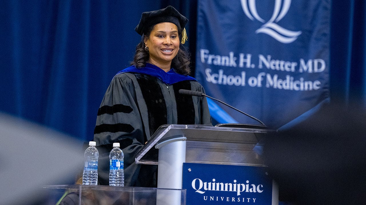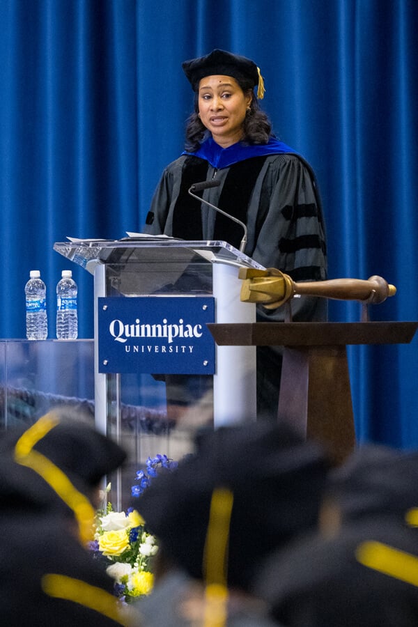 Associate Provost for Faculty Affairs Khalilah Brown-Dean officially opened the ceremony by welcoming the graduates and their guests on behalf of Quinnipiac before Anoush Calikyan ’23 sang the national anthem.