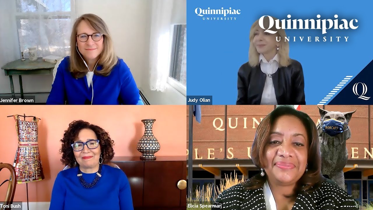 This latest installment in Quinnipiac President Judy Olian’s The Way Forward speaker series was moderated by Olian and Jennifer Gerarda Brown, dean of the School of Law. Brown described both Bush and Spearman as having embarked on “indirect but purposeful career paths in which their legal training prepared them for varied and expansive roles.”