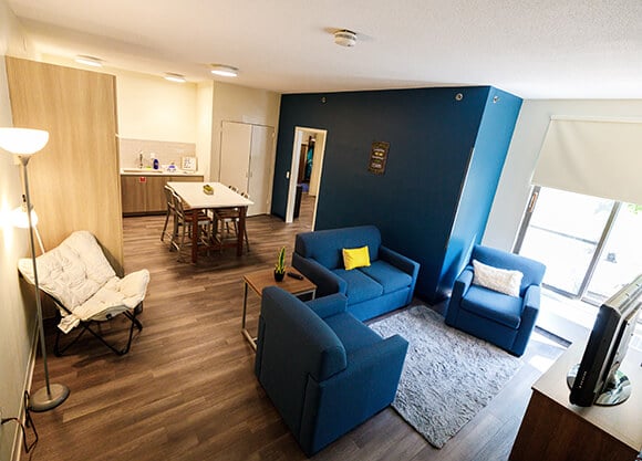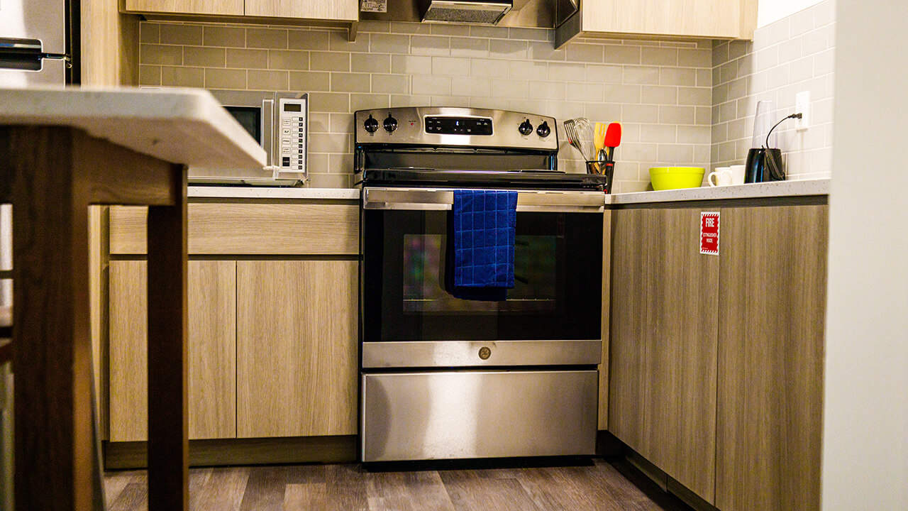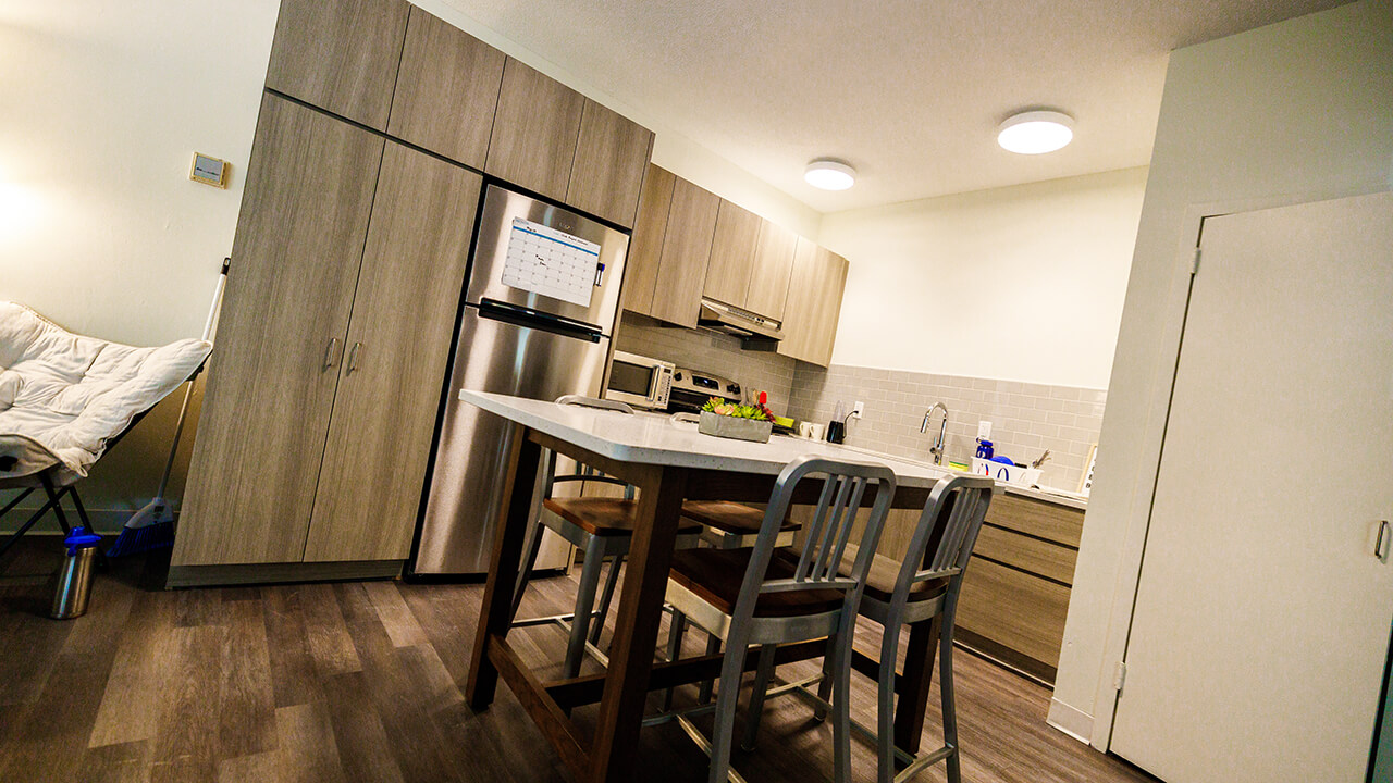 Each of the 30 suites includes a new, full-sized refrigerator, microwave and stove — along with a pantry. There’s also a new center island with stools in each kitchen area, as well as a couch and pair of chairs in each common area. Additional handicap-accessible suites were also constructed.