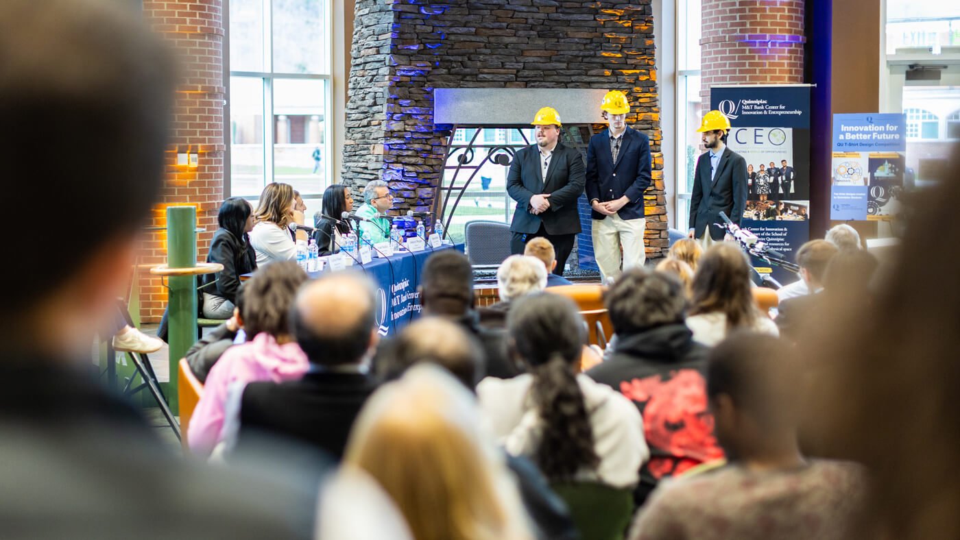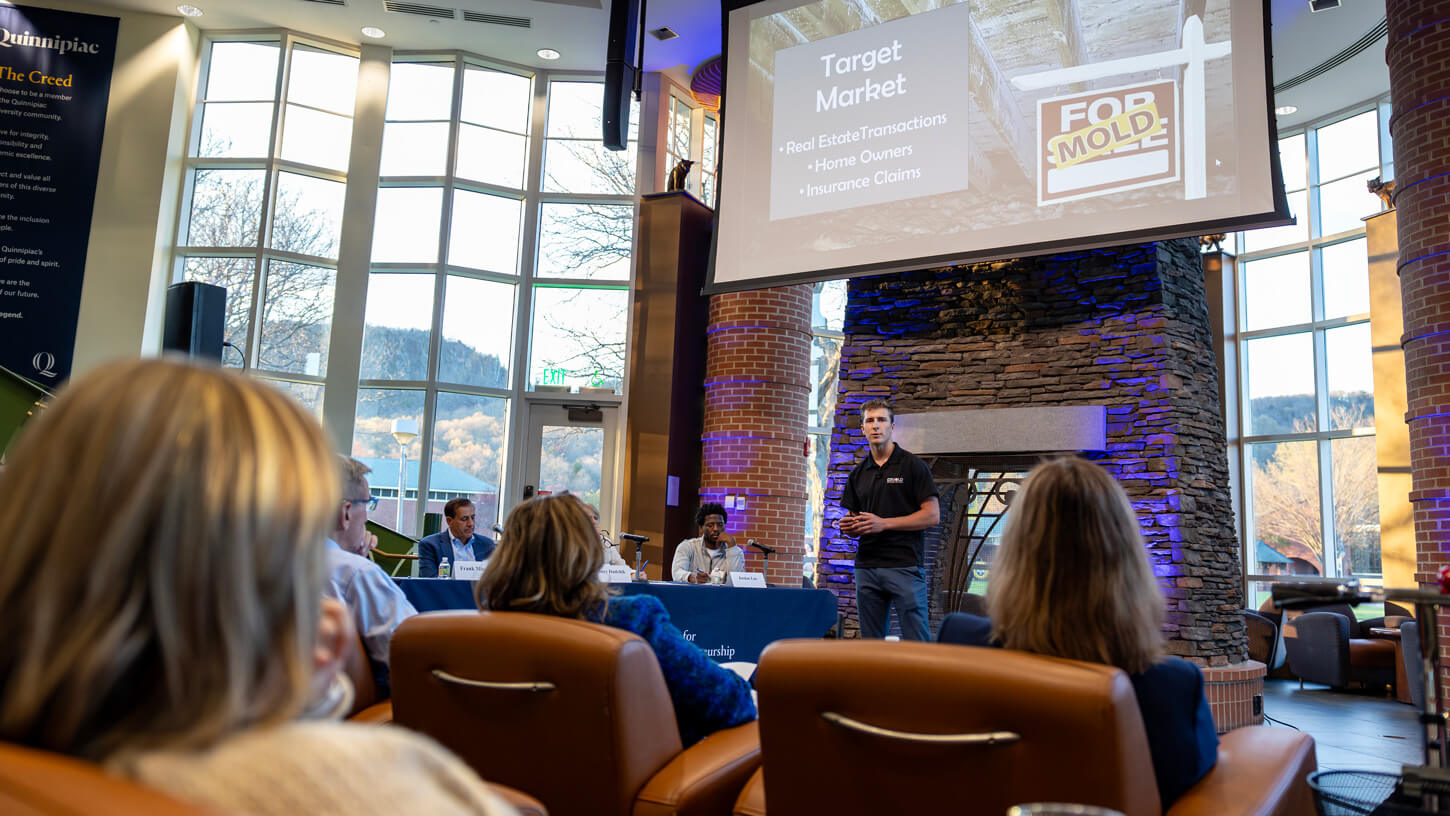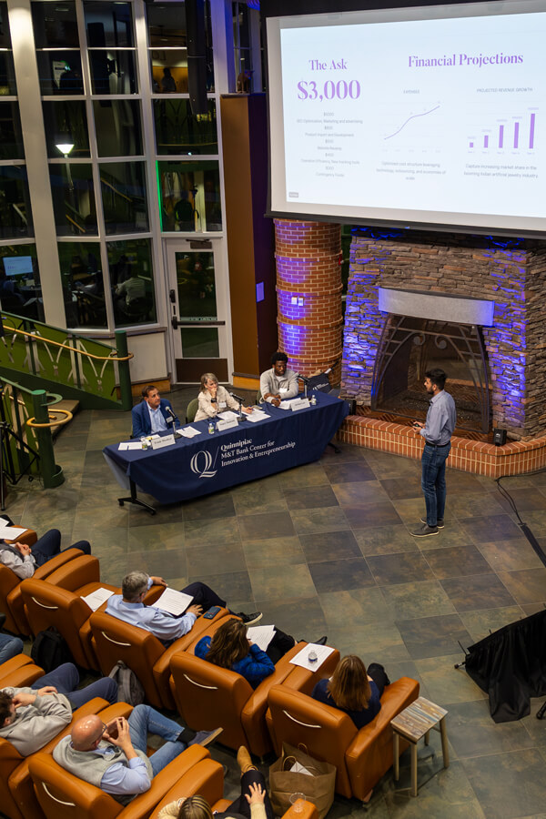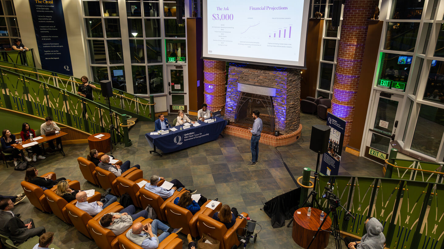 The M&T Bank Center for Innovation and Entrepreneurship hosted the annual QU Launchpad Pitch Competition on November 13, 2024, in the Piazza. This dynamic event brought together aspiring entrepreneurs to pitch their innovative business and non-profit ideas to three different panels of judges in a fast-paced format. To prepare, participants attended mandatory pitch workshops, honing their presentation skills, refining their ideas with feedback and connecting with fellow competitors. $5,000 in prize money was awarded to the finalists, with standout ideas earning overall prizes. This year’s competition featured a unique twist, with faculty members Lynn Byers, Pattie Belle Hastings and Chetan Jaiswal also presenting their own pitches, inspiring students and fostering a vibrant atmosphere of collaboration and innovation. The event celebrated creativity, entrepreneurial spirit and the diverse talents within the Quinnipiac community.