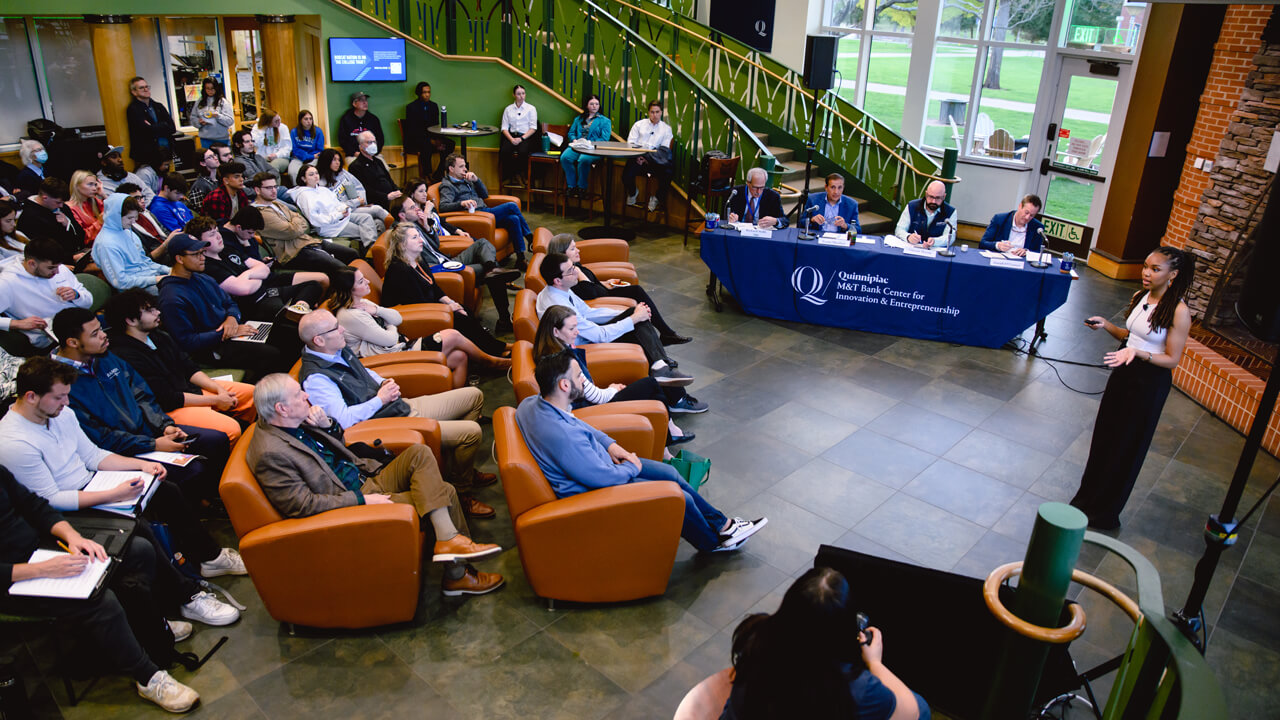 The M&T Bank Center for Innovation and Entrepreneurship, in partnership with the Hamden Regional Chamber of Commerce, hosted a Local Business Collaboration Workshop. The event brought local Hamden businesses to Quinnipiac University to share their inspiring stories and innovative ideas with students and faculty. Participants engaged in collaborative workshops, brainstorming solutions to real-world challenges faced by the businesses. This hands-on approach fostered creativity and practical problem-solving, building meaningful connections between the university and the local business community. The event was a resounding success, showcasing the power of partnerships and a shared commitment to fostering innovation and growth in the Hamden region.