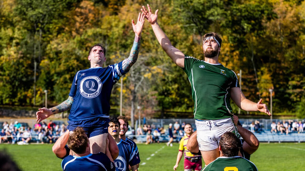 Quinnipiac Men’s Club Rugby plays in Tier 1 of the New England Wide Collegiate Rugby Conference (NEWCRC). Tier 1 of the NEWCRC includes the University of Vermont, Boston University, Norwich University, Coast Guard Academy, University of New Hampshire, Bentley University, Providence College, UMass Lowell and Sacred Heart University. The primary season is in the fall semester. Practices and tryouts begin early in the semester on Monday through Friday in the evenings, with games typically on Saturday afternoons. In the spring, the team continues to train and enter tournaments. In recent years, multiple athletes have been selected for the NEWCRC First Team and in 2019 the club team was named the Patriot Bowl Champions.