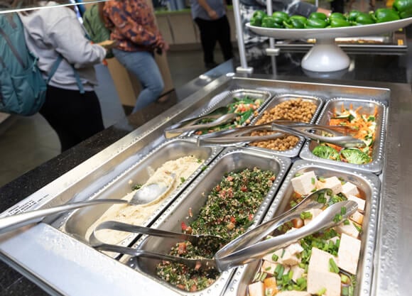 We offer Delicious Without, an allergen-friendly station that features food that is simply prepared and seasoned and served by a trained associate. This station is dedicated to foods prepared without the top nine food allergens (peanuts, tree nuts, fish, shellfish, wheat, soy, eggs, dairy, and sesame) and gluten. A main dish, a vegetable, and a gluten-avoidant grain or pasta, rice or potatoes are typically served. In addition, salads and fruit are offered. Ingredient and nutrition information can be found on our website and dining app. Join us in Café Q to try Delicious Without.