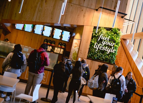 We designed the dining hall on our North Haven Campus with busy and passionate students in mind as you can purchase grab-and go meals and snacks from Outtakes, our 24-hour convenience store. Then students can enjoy the well-furnished and mellow, terrace and patio seating overlooking a tranquil pond for those times when you want to relax and enjoy a full meal.