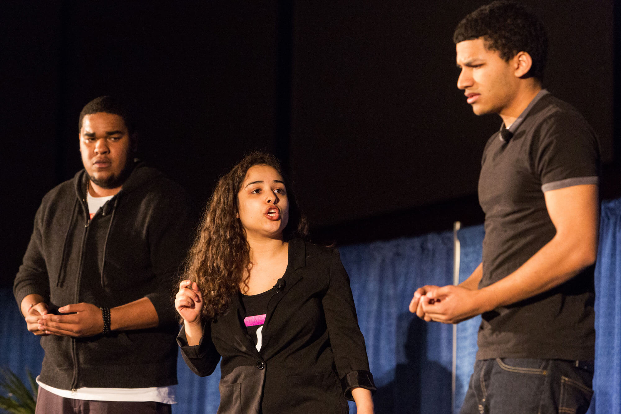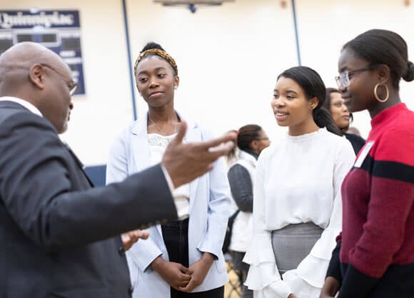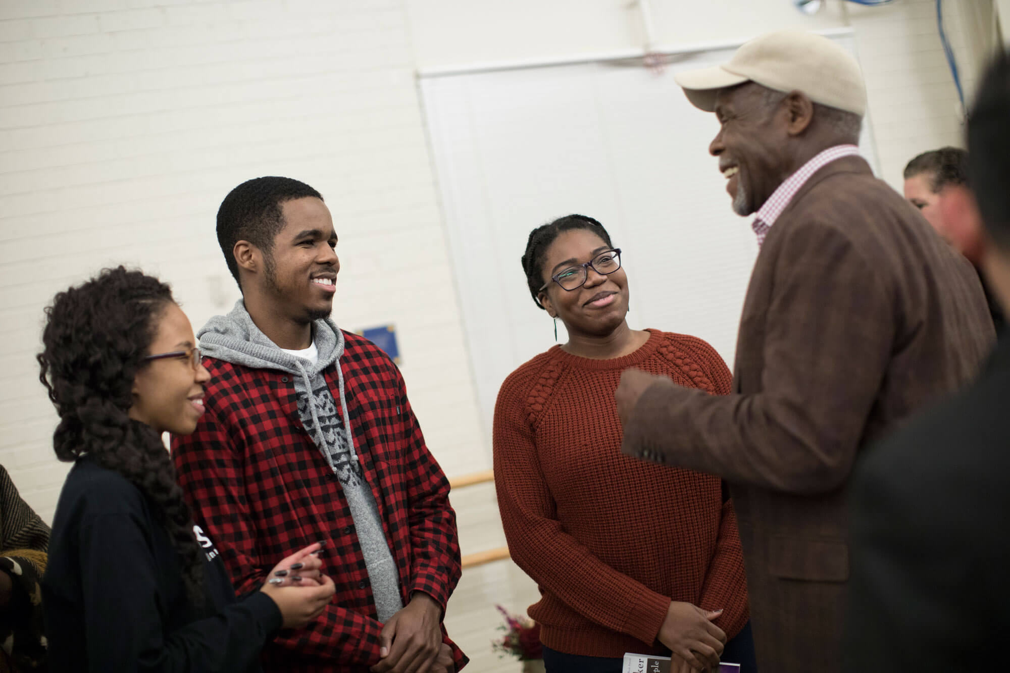 Three students speak with Richard A. Robinson during the Black History Month event.