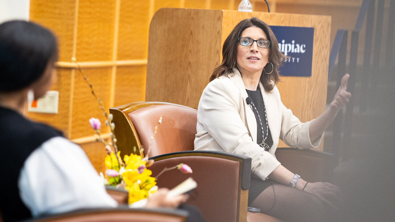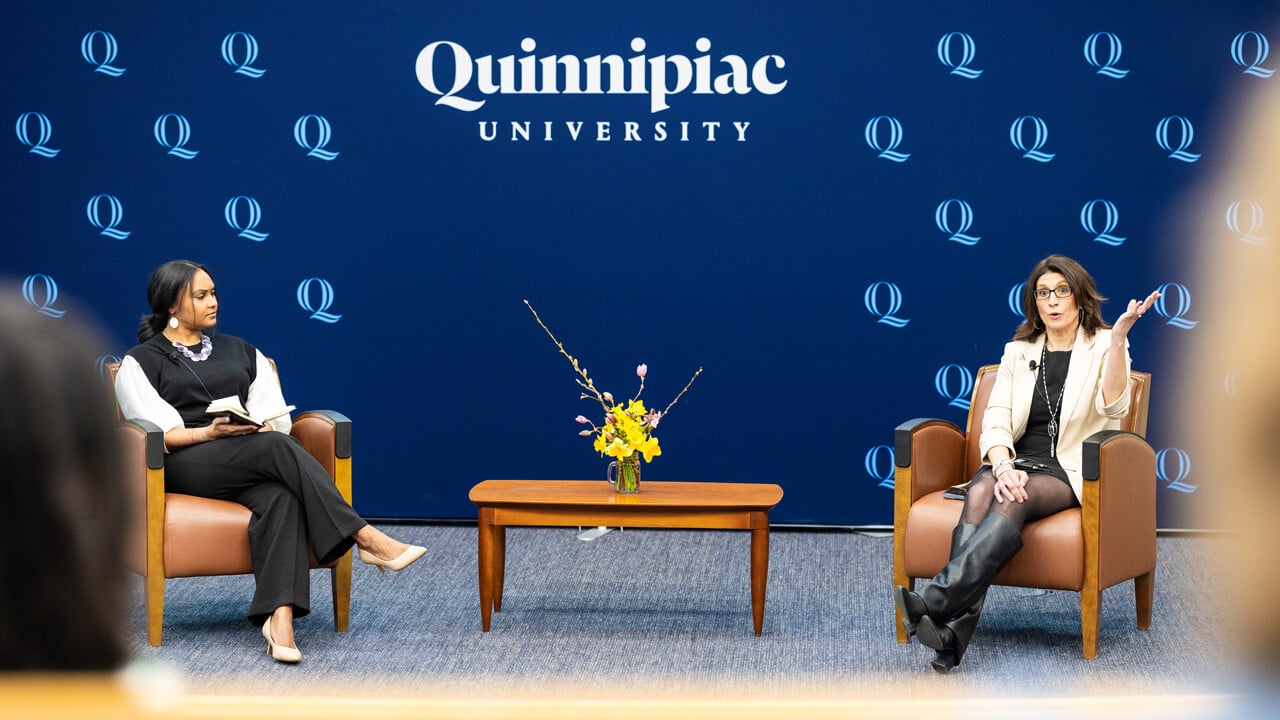 Harris’ talk, “We’re All Part of This Story,” was hosted by the Office of Inclusive Excellence for Quinnipiac’s ongoing Critical Conversation Speaker Series. Her discussion focused on indigenous communities, people’s rights and how the Mohegan Tribe works with external communities and institutions. Harris also shared a fireside chat with Jennifer Rawlings, JD ’15, tribal affairs director for the Center for Indigenous Peoples Rights, and answered questions from the audience.