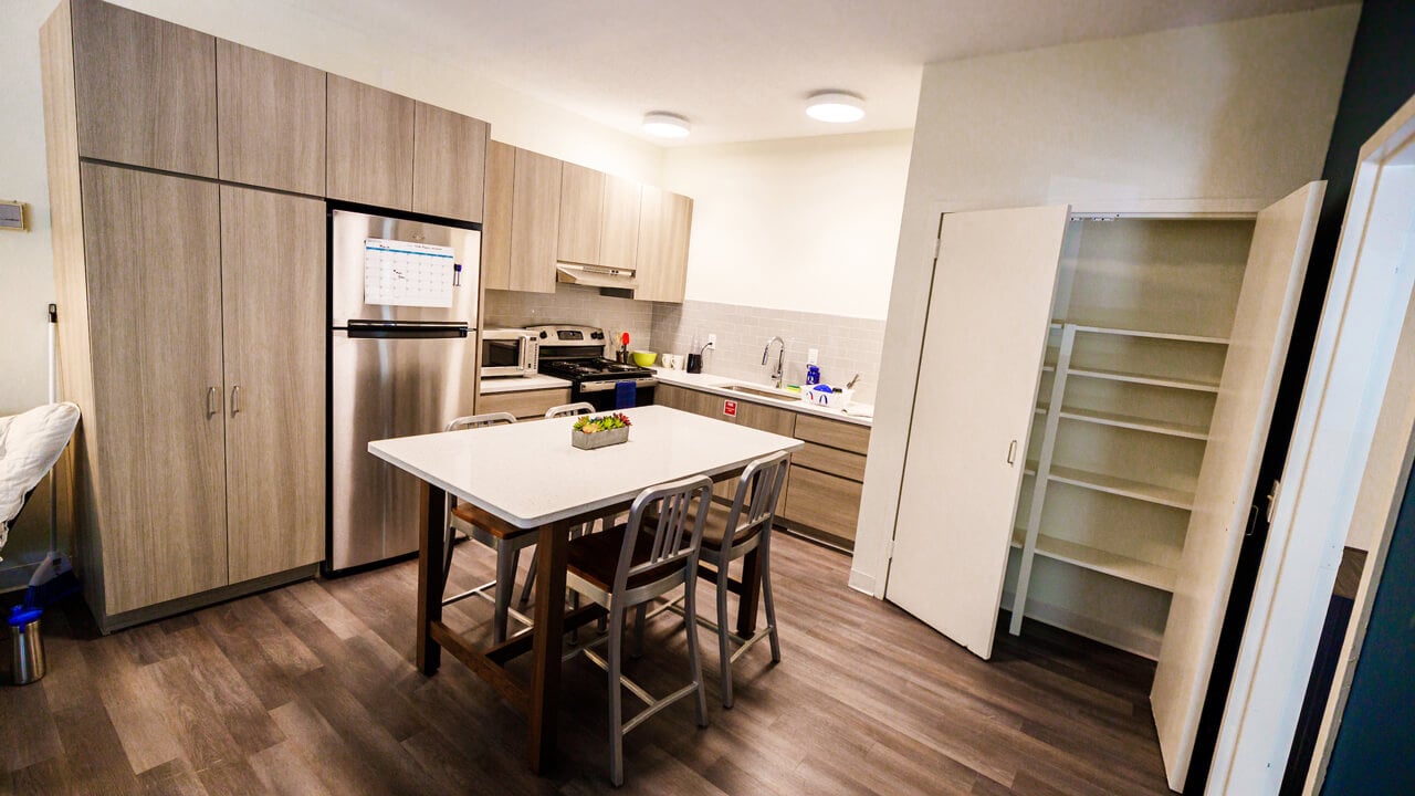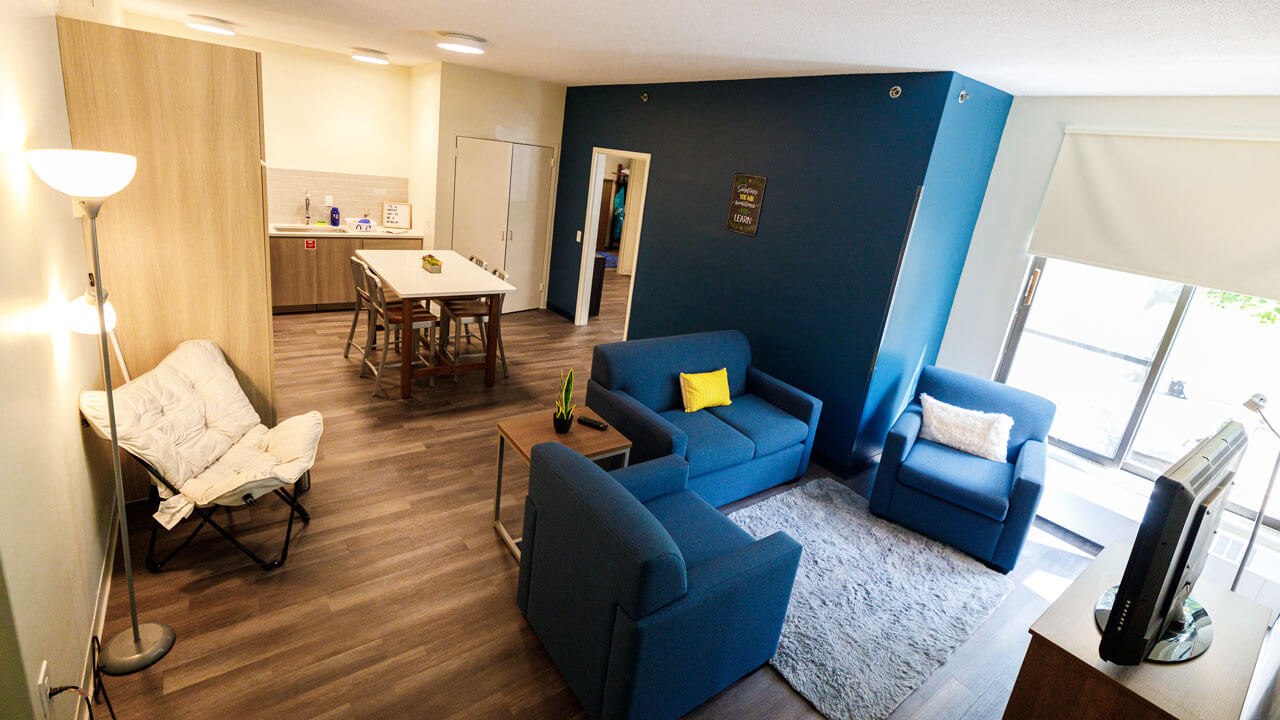 The Complex consists of three residence halls — Bakke, Founders, and Sahlin — that are situated close together in the heart of the residential area to facilitate student connections with fellow residents. There are 30 apartments total in the three halls, each consisting of two singles and a double bedroom. The apartments were recently renovated and feature adjustable bedroom furniture, a kitchen island that doubles as a dining table, a love seat, a side chair, side tables and a media unit. The open layout and large common room are wonderful spaces for residents to gather and socialize. The residence halls are on the Mount Carmel Campus, with stunning views of the Sleeping Giant State Park and a courtyard outside where residential life staff host social events throughout the year.