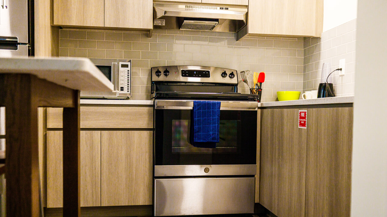 Each apartment in The Complex houses 4 students in 3 bedrooms (2 singles and 1 double), and includes a bathroom, a living room and a kitchen. A full meal plan is required in this residence hall. Learn more about meal plans